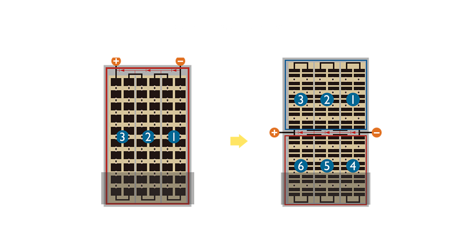 • 结合半切电池,降低遮阴影响、提升模组抗隐裂能力、并减少电阻损耗,进一步提升模组发电效能。